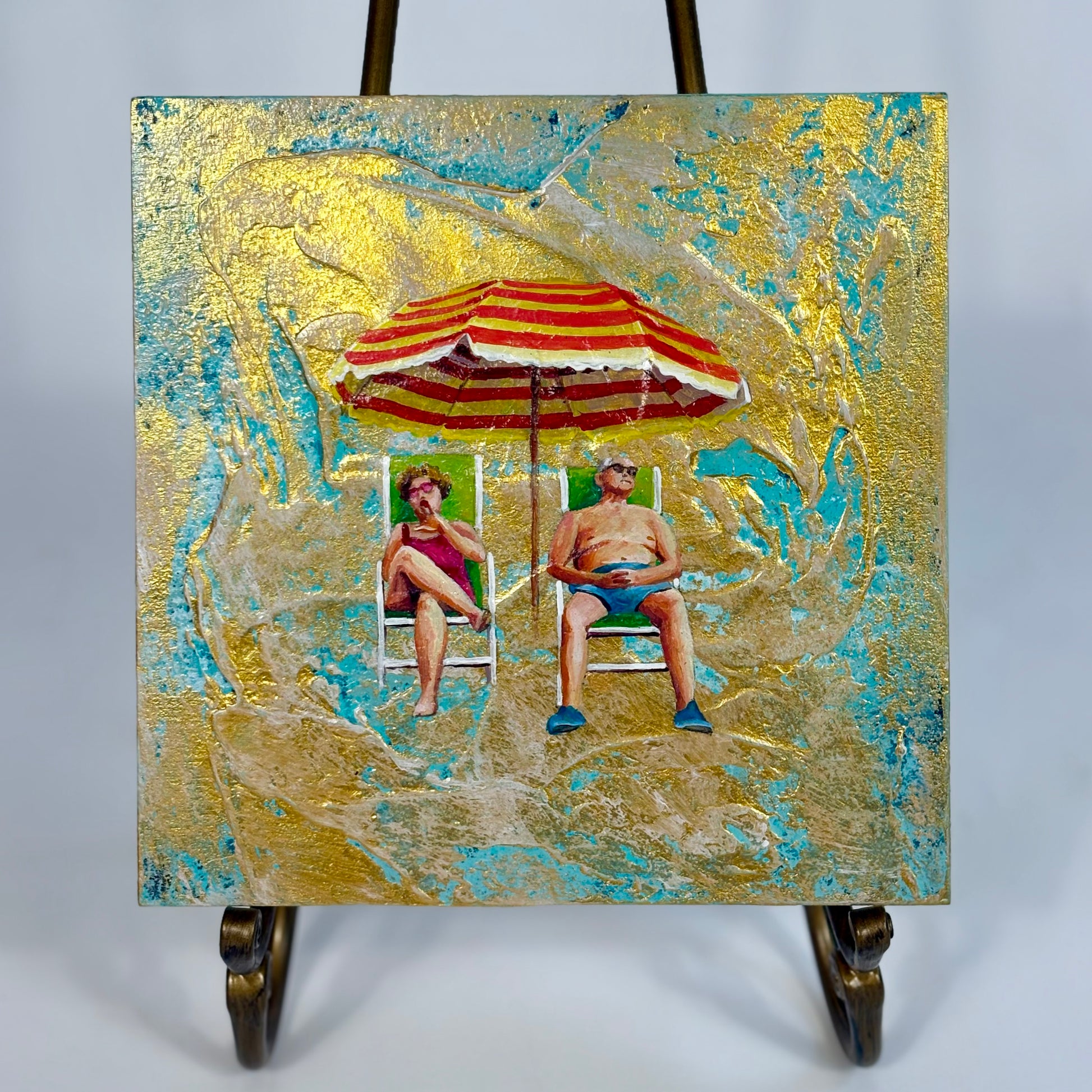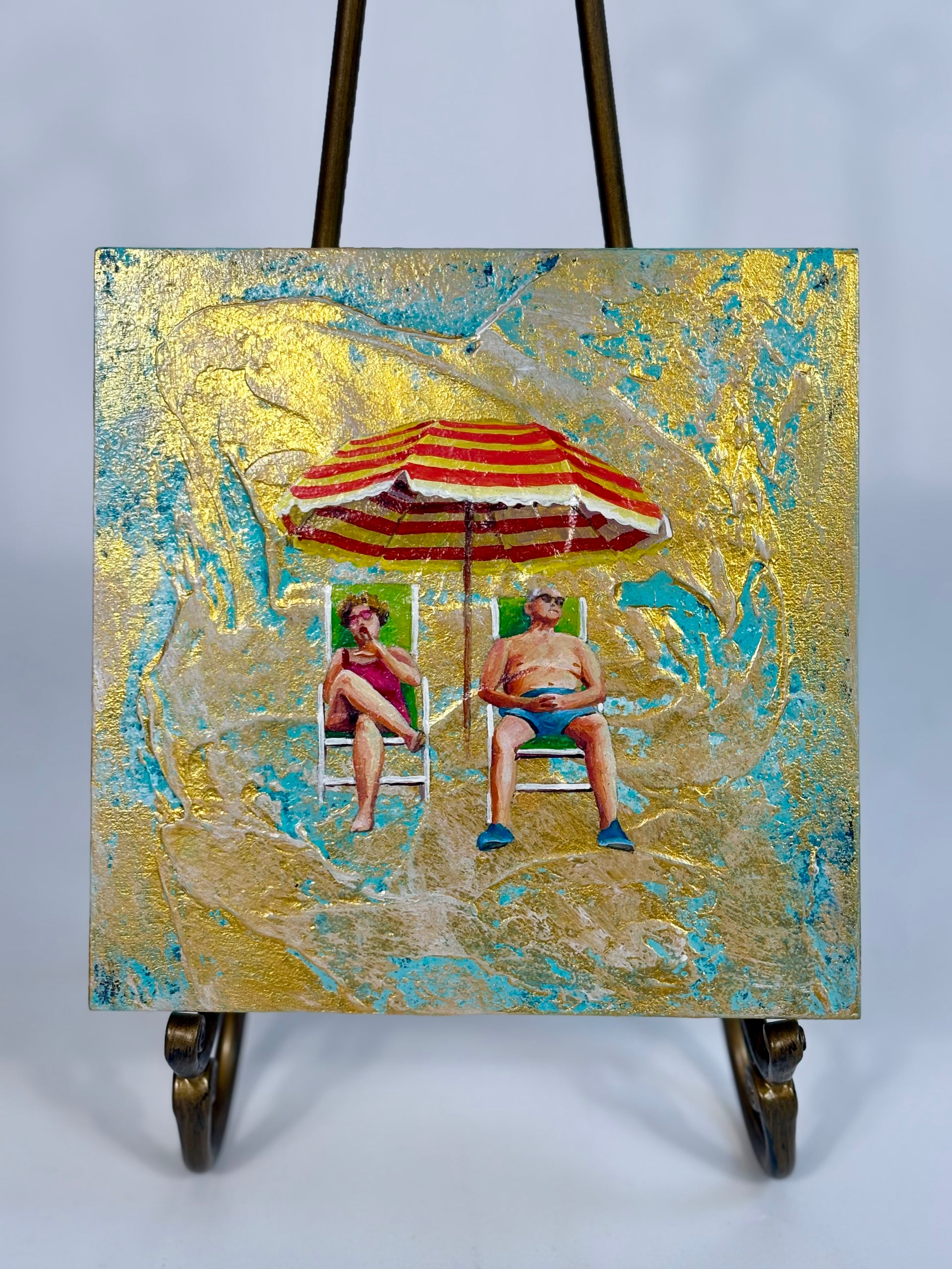 Introducing "Early Retirement", a tropical addition to the "Marie's Miniatures" collection. This particular piece was meticulously hand-painted on a wooden canvas, using a variety of acrylic paints and artist molding paste to create an intricately detailed design with a unique texture. Sunbathing in style, this painting brings joy and relaxation to a whole new level.