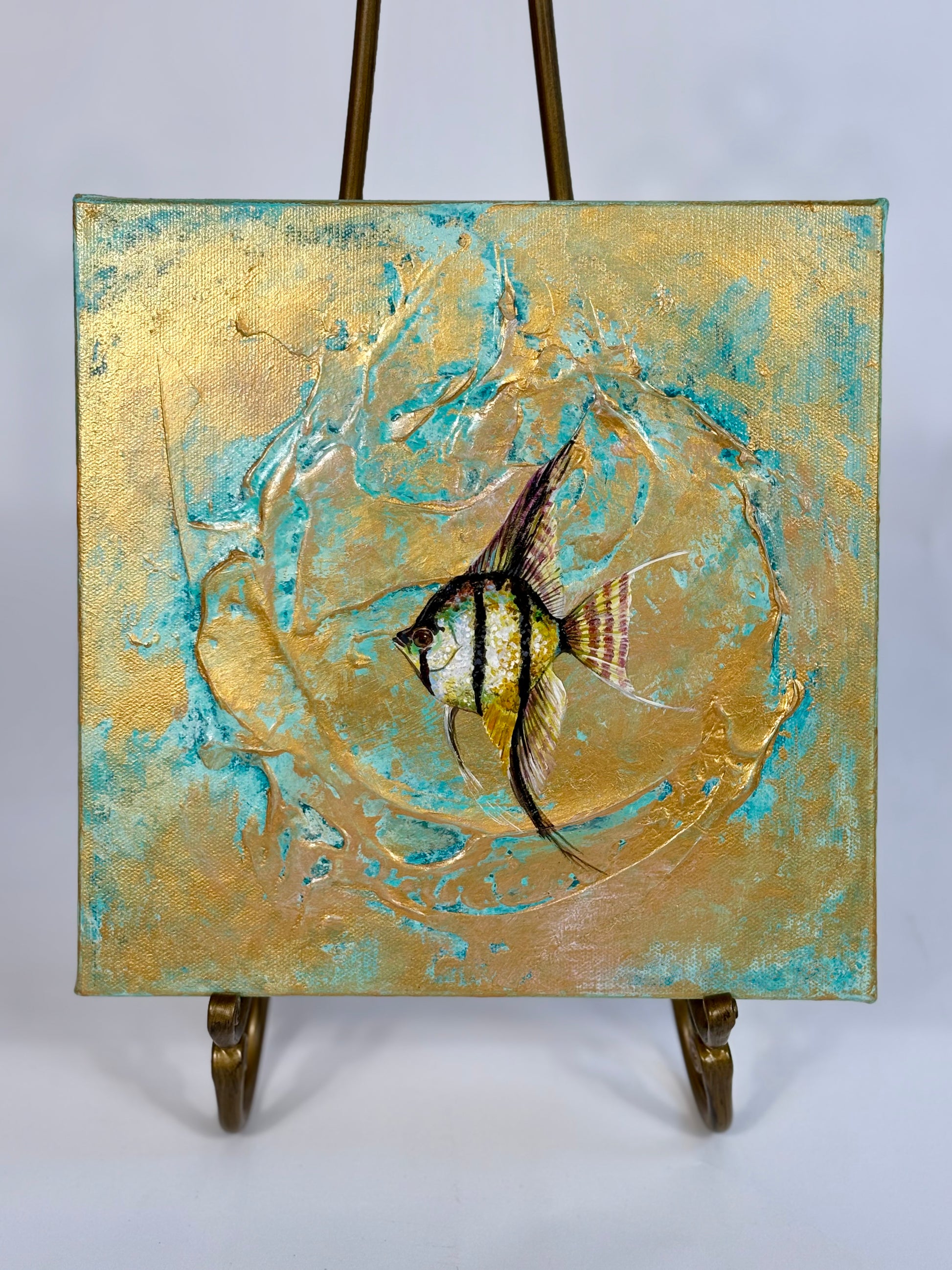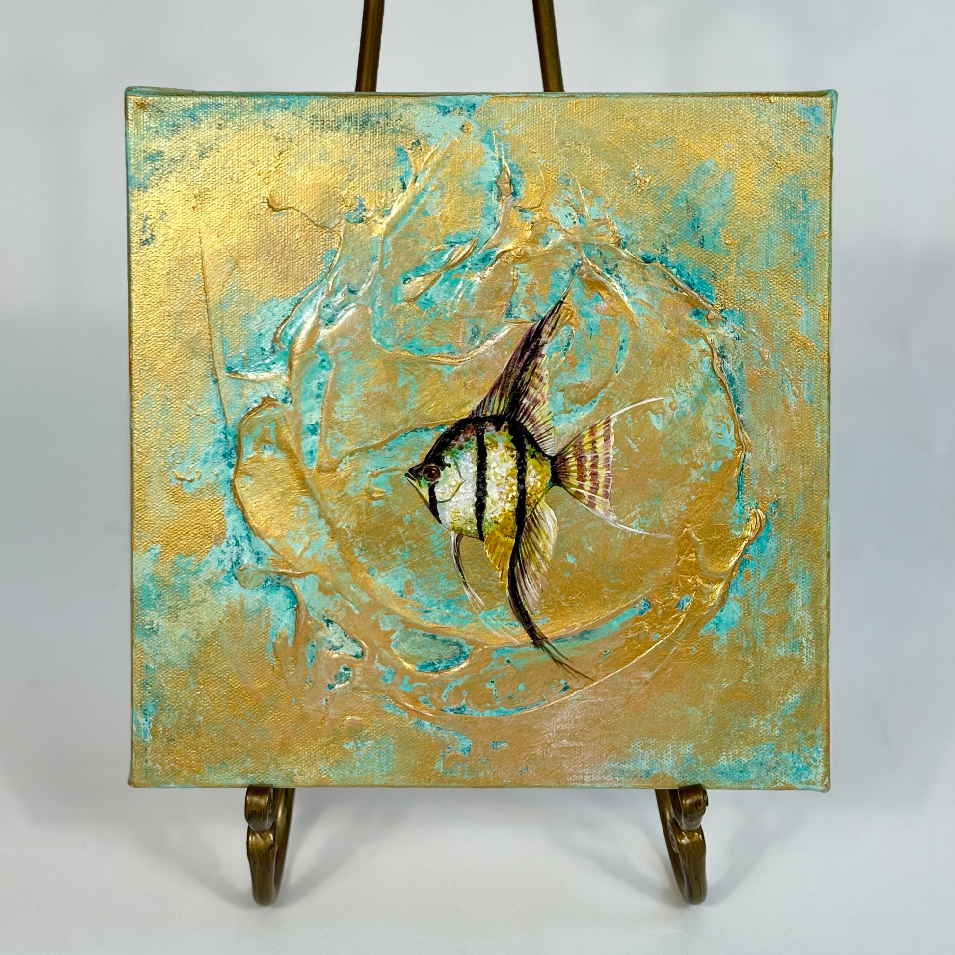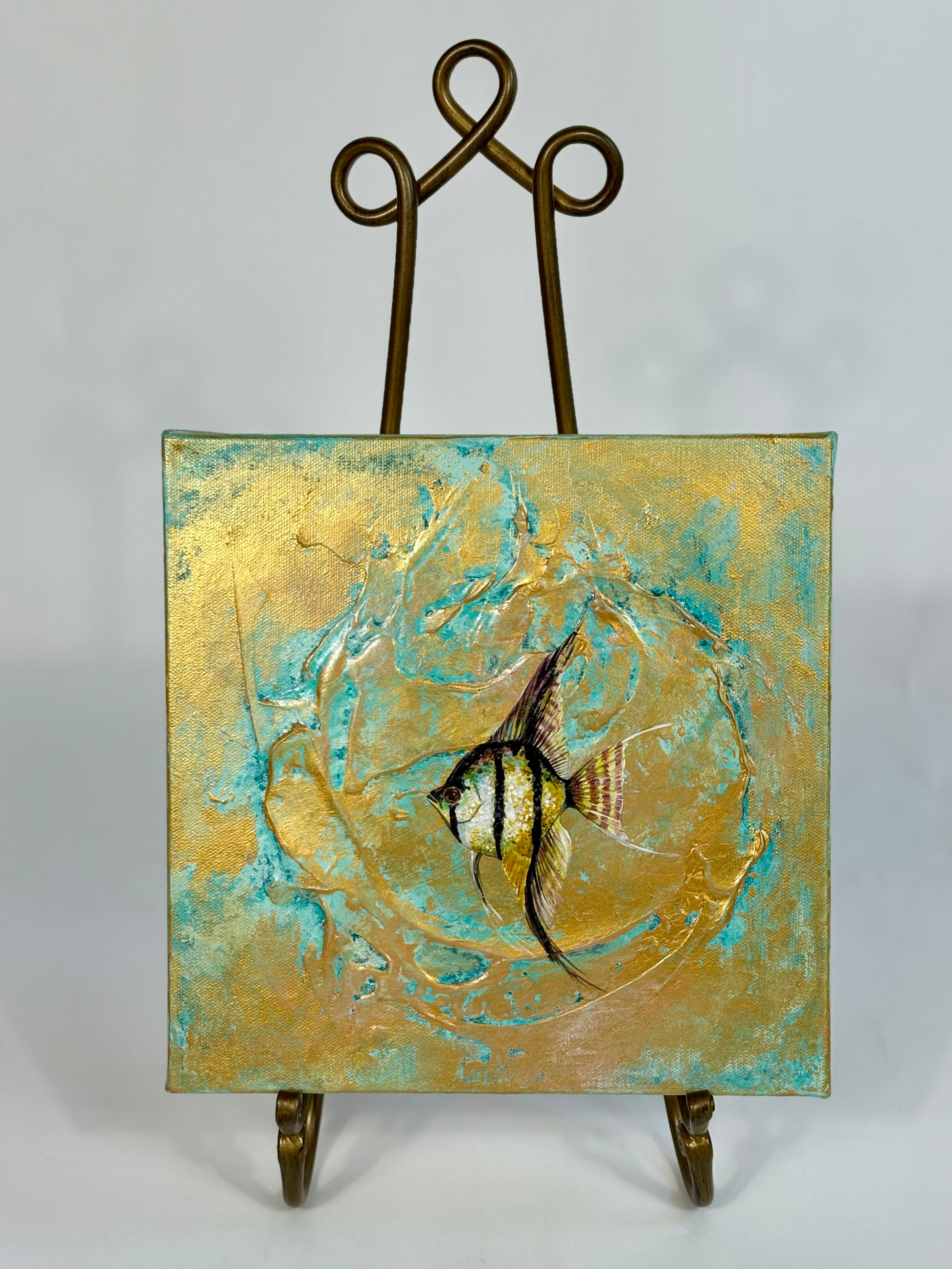 Introducing "Striped Fish", an aquatic addition to the "Marie's Miniatures" collection. Each piece is meticulously hand-painted on wrapped gallery canvas, using a variety of acrylic paints and artist molding paste to create intricately detailed designs with unique textures. With the gold and blue hues of the background, it creates the illusion of light reflecting through the ocean.