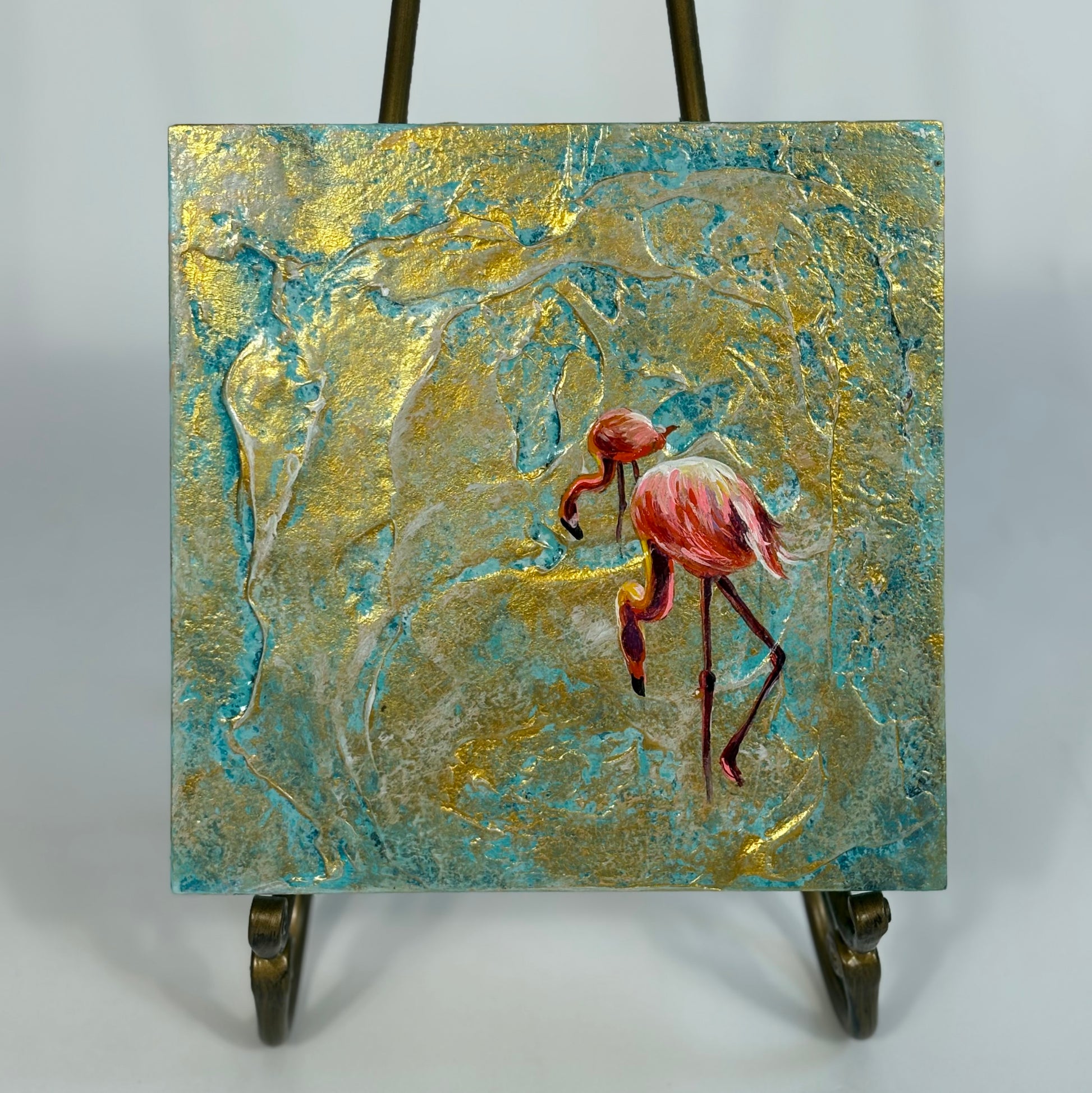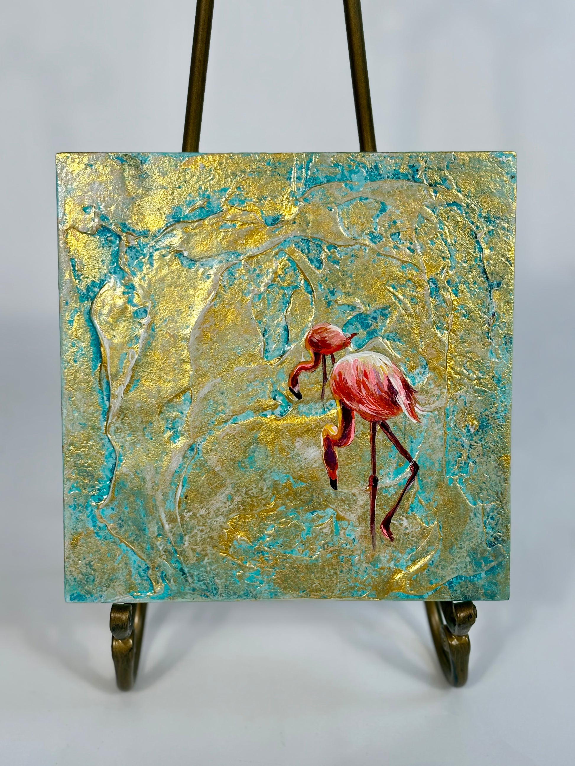 Introducing "Flamingle", the very first addition to the "Marie's Miniatures" collection. This particular piece was meticulously hand-painted on a wooden canvas, using a variety of acrylic paints and artist molding paste to create an intricately detailed design with a unique texture. Bathed in gold, this piece brings sunshine into any space!
