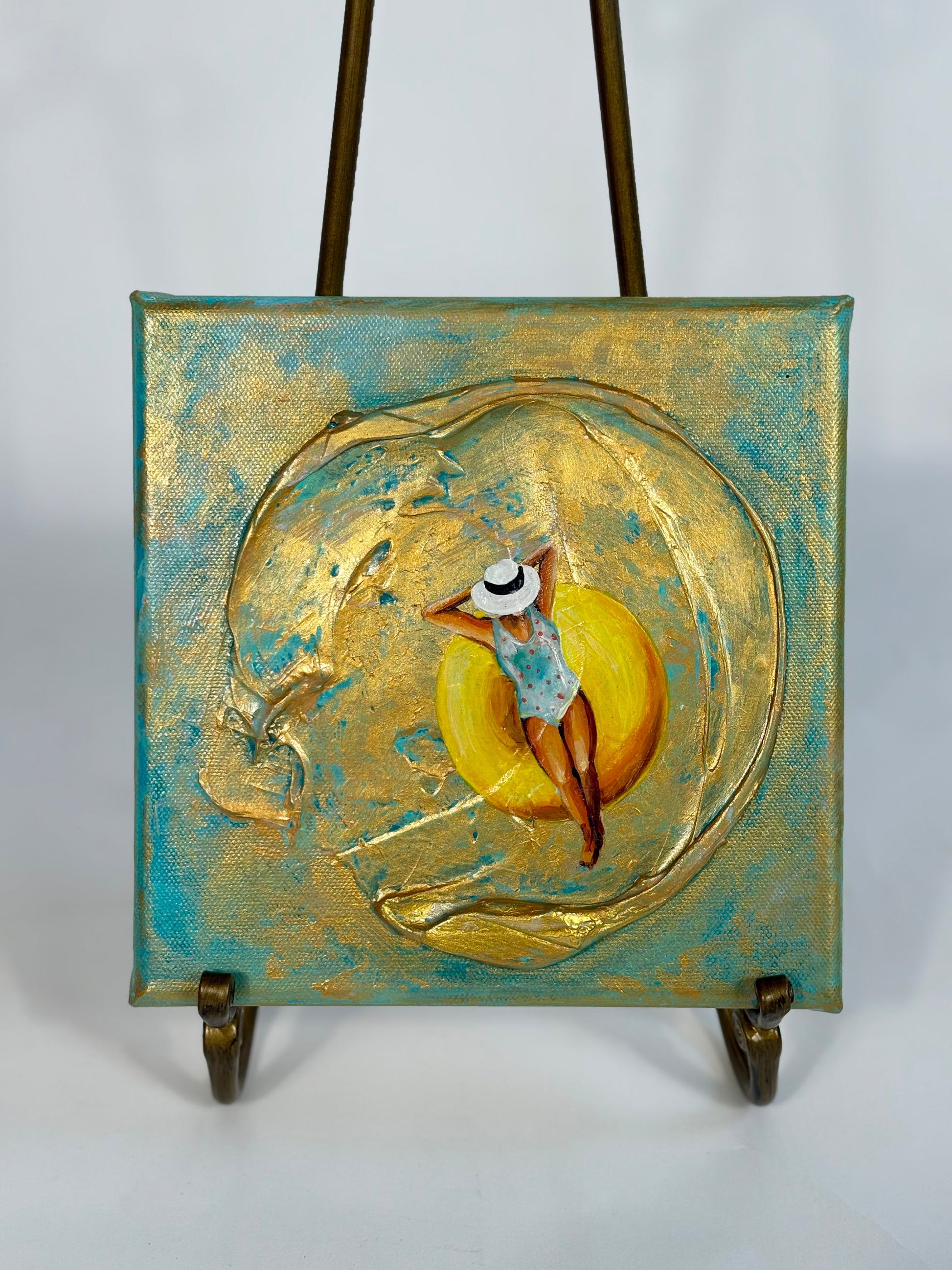 Introducing "Floating Lady", a sunny addition to the "Marie's Miniatures" collection. Each piece is meticulously hand-painted on wrapped gallery canvas, using a variety of acrylic paints and artist molding paste to create intricately detailed designs with unique textures. Bathed in gold, this piece brings sunshine and relaxation into any space!