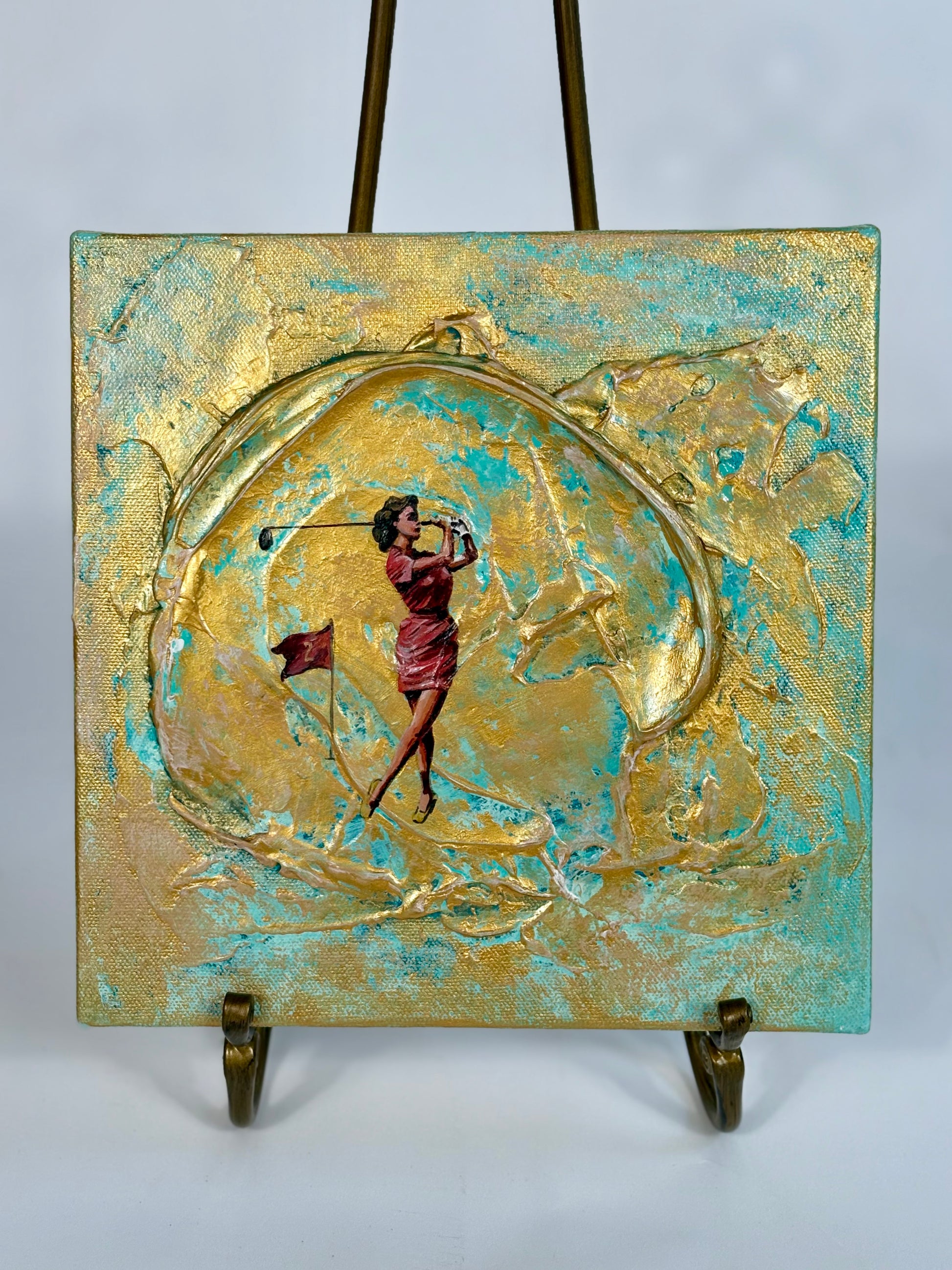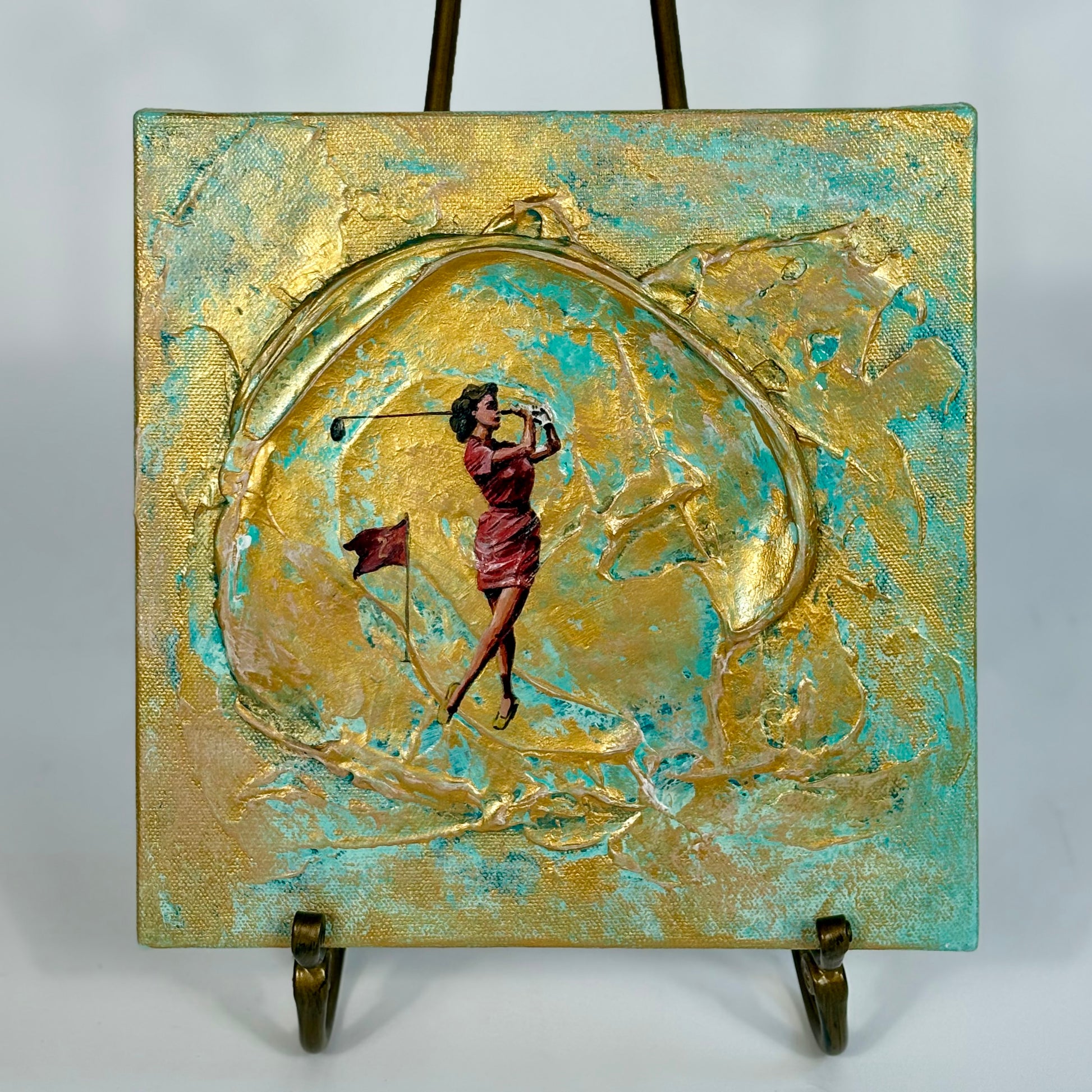 Introducing "Golf Lady", a sporty addition to the "Marie's Miniatures" collection. Each piece is meticulously hand-painted on wrapped gallery canvas, using a variety of acrylic paints and artist molding paste to create intricately detailed designs with unique textures. Such a fabulous way to commemorate another favorite pastime hobby!