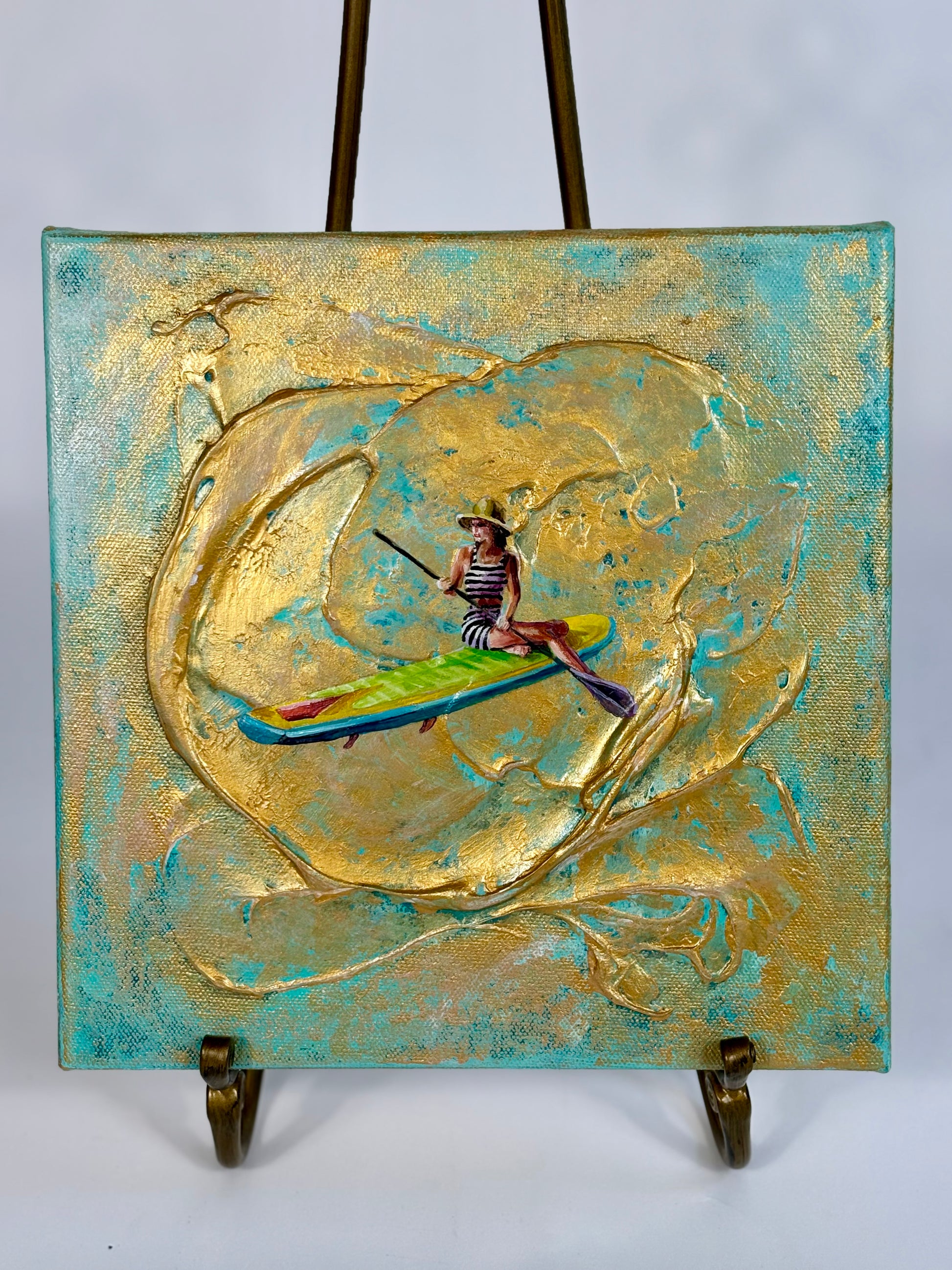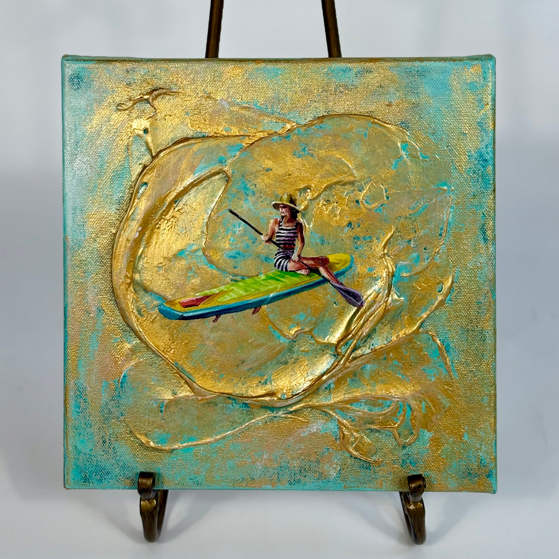 Introducing "Paddle Board", a sporty addition to the "Marie's Miniatures" collection. Each piece is meticulously hand-painted on wrapped gallery canvas, using a variety of acrylic paints and artist molding paste to create intricately detailed designs with unique textures. Float along in style with this fun artwork.